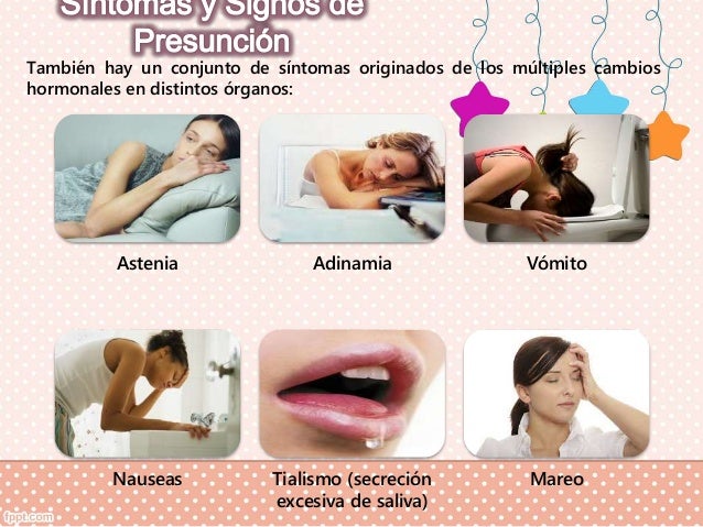 Tal vez el primer signo presuntivo del embarazo sea la amenorrea o ausencia del período menstrual. Debido a que puede ocurrir amenorrea por causas distintas a un embarazo, no siempre es tomada en cuenta, especialmente si la mujer no tiene ciclos regulares. Sin embargo, pueden presentarse varios signos más que, junto a la amenorrea sugieren un embarazo, como son: la hipersensibilidad en los pezones, mareos, vómitos matutinos, somnolencia, alteración en la percepción de olores, y deseos intensos de ciertos tipos de alimentos (antojos). Esto lo puedes notar a partir del segundo al tercer mes de la concepción.
